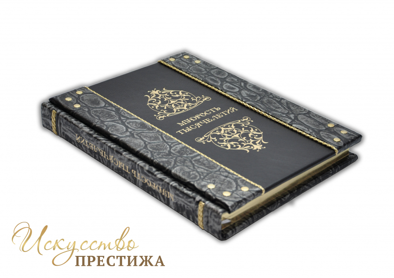 Французский составной переплет ручной работы, выполнен из комбинации натуральных кож (Кожа «Plonge Brown», Кожа «Argento dinosauro» производства итальянской кожевенной фабрики «Claudio». Обложка книги двухуровневая оформлена рельефным золотым тиснением (фольга «Luxor 240»), вставками из плетенного Кожаного шпагата (цвет «Bronze»), латунными холитенами, количеством 12 шт. Обрез книги вручную полирован и позолочен сусальным золотом.
