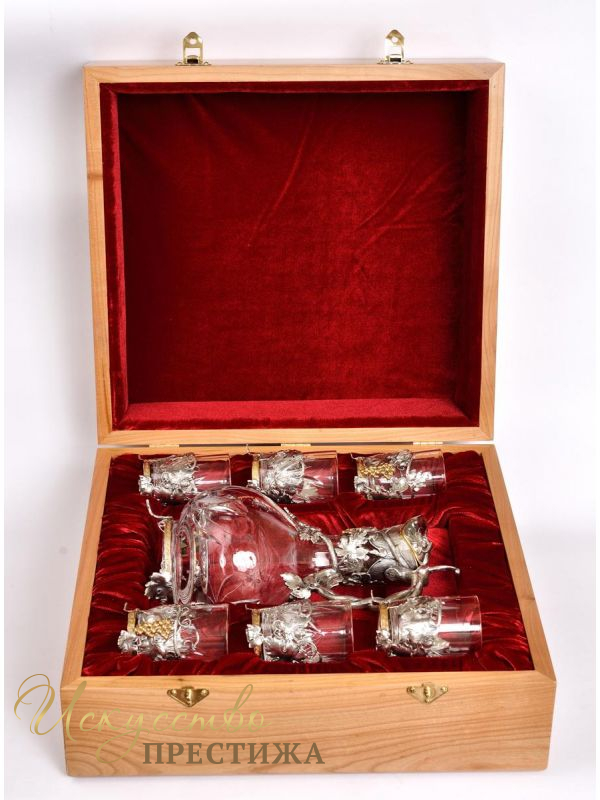 Набор для напитков состоит из хрустального графина и шести рюмок с накладками из серебра в виде плетущейся виноградной лозы с листьями и большими гроздьями винограда. Высота графина: 20 см. Объем: 450 мл. Высота рюмки: 7,5 см. Объем: 70 мл.