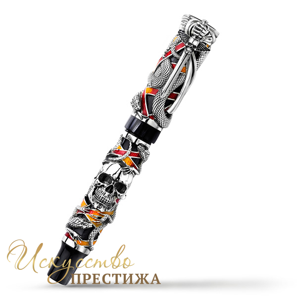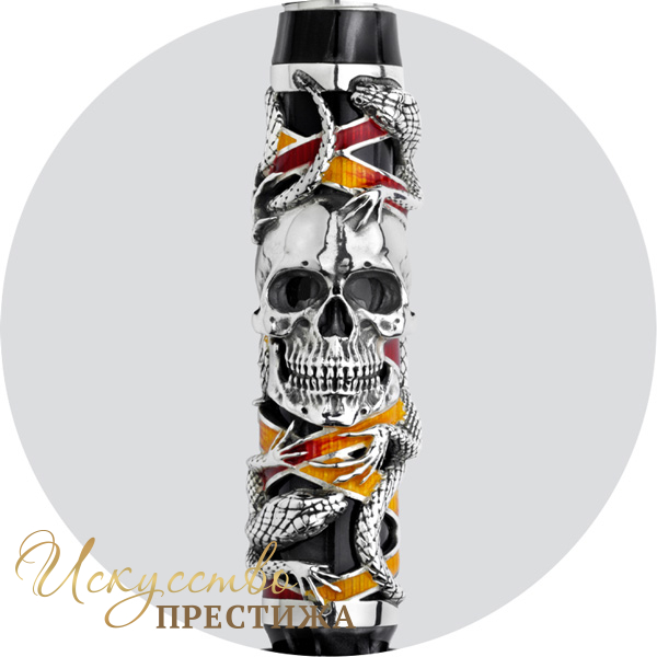 Роскошный письменный инструмент, изготовленный из драгоценного перламутрового целлулоида черного цвета и серебра, декорирован реалистичными фигурами змеи и ящерицы, символами зарождения жизни, и величественным черепом, олицетворением как смерти, так жизненной энергии и интеллекта. Все детали отличает тонкая фигурная резьба ручной работы. Особый акцент — вставки из полупрозрачной эмали, которым мастера Montegrappa придали некоторые черты Античности. Оригинальный зажим ручки выполнен в форме крылатого меча с изображением черепа. Завершает композицию изящное перо из белого золота в 18 карат.