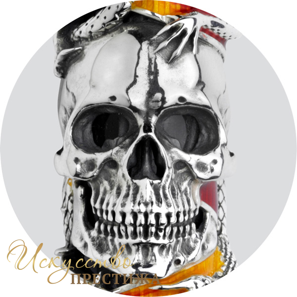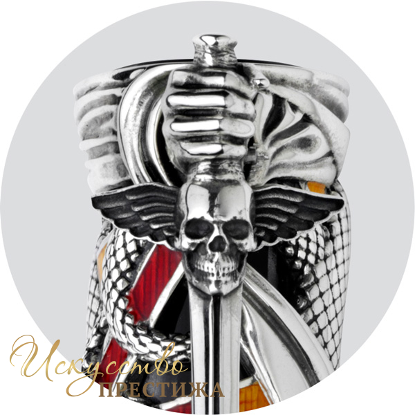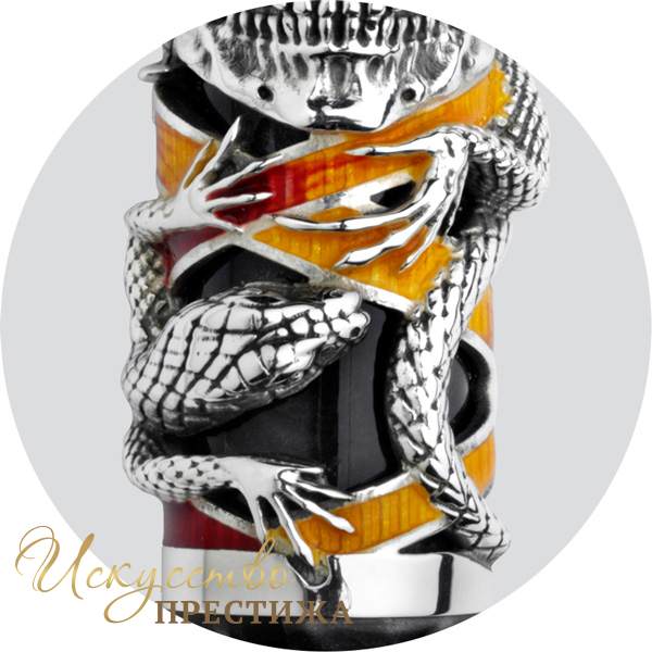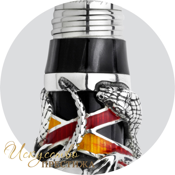 Ручка идет в комплекте с неординарной чернильницей из горного хрусталя, крышку которой венчает реалистичная фигура змеи, выполненная из серебра. Традиционные для коллекции вставки из цветной эмали гармонично переплетаются на аксессуаре, соприкасаясь с величественными черепами. Кольца чернильницы украшены гравировкой в виде логотипа Montegrappa.