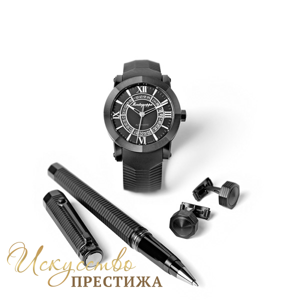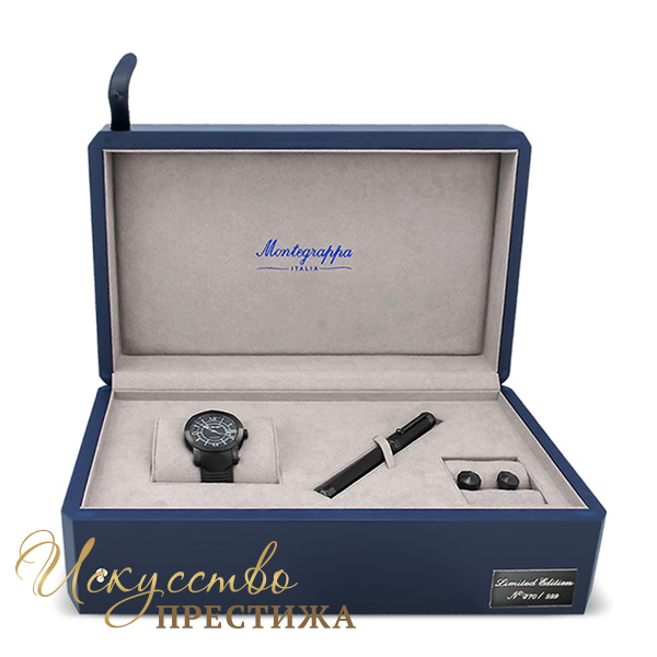 Особое украшение набора — стильные часы со швейцарским механизмом ETA-2824. Водонепроницаемость модели — до 40 метров. Дизайн часов объединяет элементы классического и спортивного стиля. Изысканный черный циферблат украшают контрастные стрелки и цифры, скрытые под антибликовым сапфировым стеклом. Центральная часть отмечена сдержанным логотипом Montegrappa. Специальное PVD-покрытие защищает аксессуар от механических повреждений. Часы идут в комплекте с эффектным ремнем, декорированным тонкими линиями, которые повторяют трехмерный узор письменного инструмента и запонок.