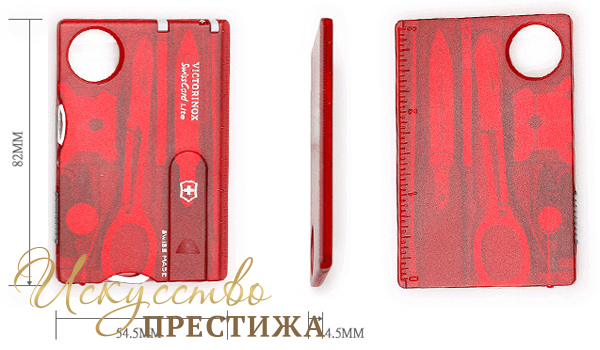 Выполненный в компактной форме кредитной карты набор Victorinox "SwissCard Lite Onyx" 0.7300.T без всякого труда помещается в вашем кармане или бумажнике. Несмотря на свои миниатюрные размеры, SwissCard не уступает в своей практичности и универсальности, в силу того, что укомплектован инструментами первой надобности. Модель имеет конструкцию, состоящую из ножа для писем, ножниц, булавки (нержавеющая сталь), большой и малой плоской отвёртки, пилки для ногтей, крестовой отвёртки, пинцета, зубочистки, шариковой ручки, линейки (дюйм, см). Дополнительно производитель укомплектовал этот аксессуар увеличительным стеклом и светодиодным фонариком. Набор позволяет без труда выполнять 13 функций и будет незаменимым спутником в любой поездке.