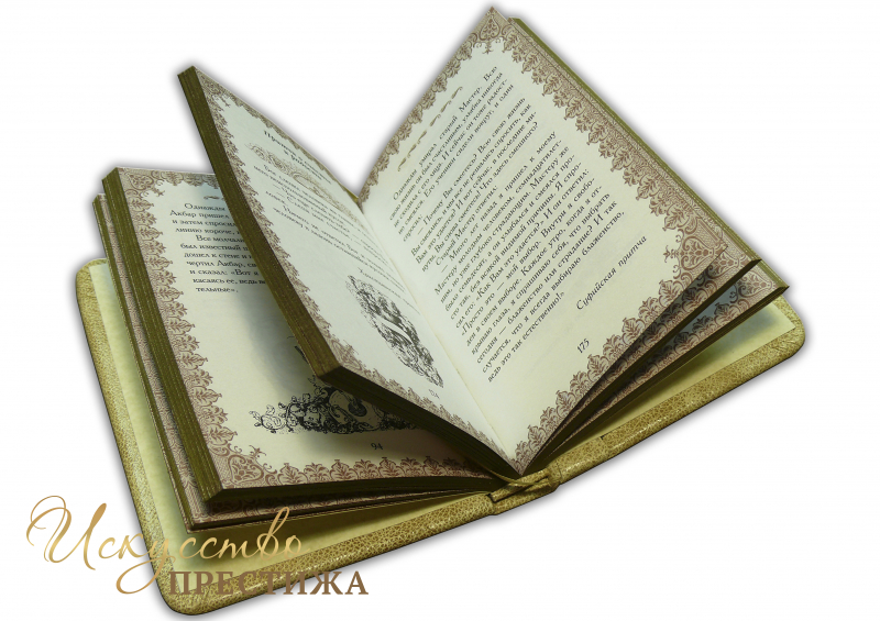 Подарочное издание удобного формата, гармонично оформленное цветной печатью. Французский составной переплет ручной работы, выполненный из натуральной кожи «Marma Parle» производства кожевенной итальянской фабрики «Claudio». Обложка книги оформлена многоуровневым тиснением – глубоким блинтовым и рельефным золотым, с использованием золотой фольги «Luxor 240». Обрез полирован и окрашен вручную, цвет «Bronze».
