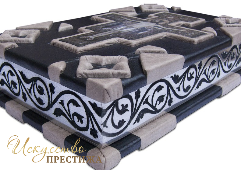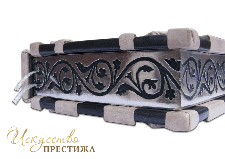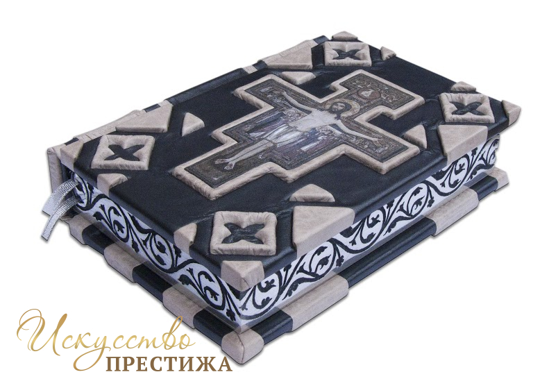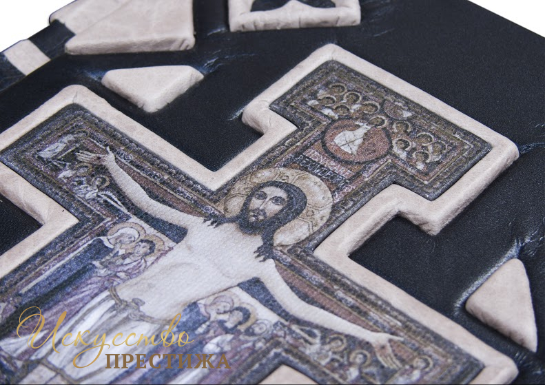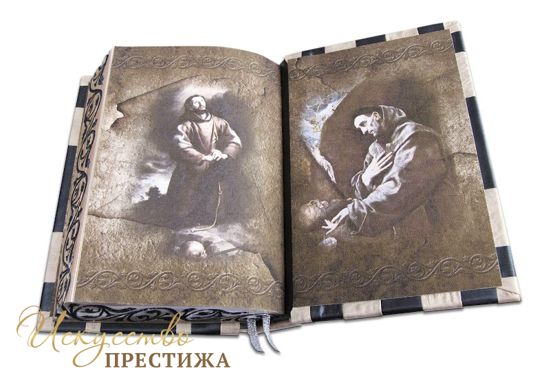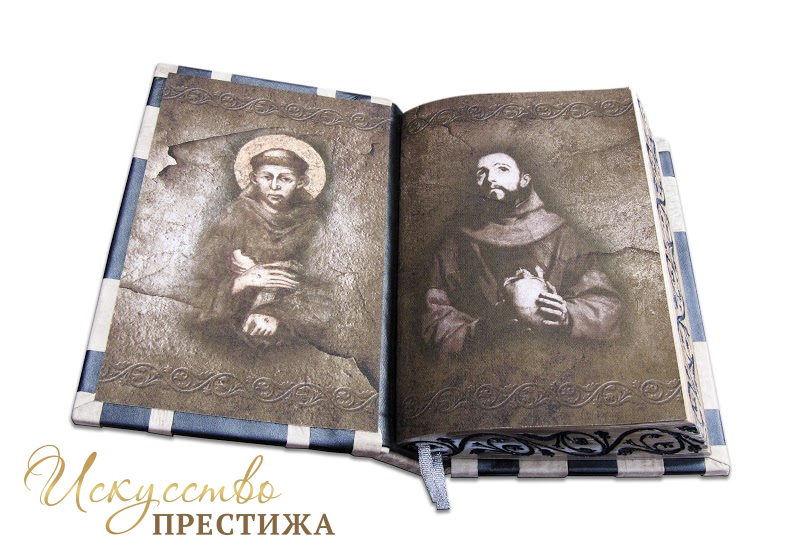 Французский составной переплет ручной работы изготовлен из комбинации натуральной кожи (кожа «Crepa grigio», кожа «Metallico in acciaio» производства итальянской кожевенной фабрики «Carisma»). Обложка книги многоуровневая, оформлена объемными узорами ручного затягивания в кожу, репродукцией на холсте «The San Damiano Cross»? декорирована серебряным тиснением, использована фольга «Luxor 240». Обрез книги объединил в себе гравировку и серебрение. В комплекте сертификат, бархатный чехол.