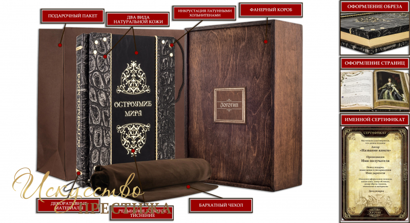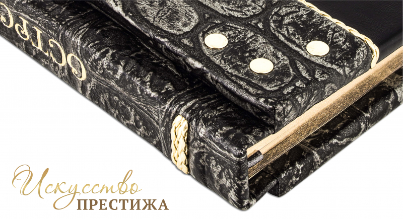 Французский переплет ручной работы, выполнен из комбинации натуральных кож (Кожа «Plonge Brown», Кожа «Argento dinosauro» производства итальянской кожевенной фабрики «Claudio». Обложка книги двухуровневая оформлена рельефным золотым тиснением (фольга «Luxor 240»), вставками из плетенного Кожаного шпагата (цвет «Gold»), латунными холитенами, количеством 12 штук. Обрез вручную полирован и позолочен сусальным золотом.