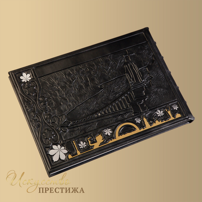 О переплете: Переплет французский цельноКожаный. Ручная работа. Рельефные бинты на корешке. Кожа, цвет - "черное Дерево" (Италия). В центре - стилизованная художественная композиция ; Каптал шелковый, ручного плетения. Форзац составной. Обрез полированный, окрашенный вручную, цвет - "серебро".