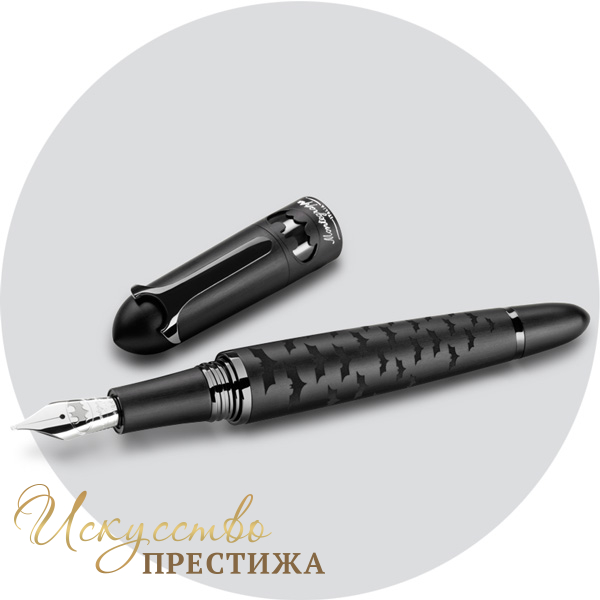 Стильную перьевую ручку отличает неординарный дизайн. Выбор материалов, цвет и оригинальная гравировка перекликаются с костюмом Бэтмена. Письменный инструмент изготовлен из алюминия и декорирован экстравагантным узором в виде летучих мышей в полете. Особый нюанс — роскошное черное анодированное покрытие, которое ненавязчиво выделяет лаконичные детали из рутеиновой латуни. Завершает композицию изящное перо из белого золота в 18 карат, украшенное логотипом в виде летучей мыши.