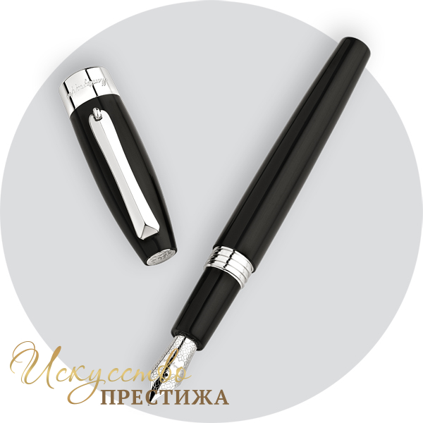 Изысканная перьевая ручка гармонично совмещает в себе утонченную роскошь и лаконичный дизайн. Стильный корпус письменного инструмента изготовлен из драгоценной смолы черного цвета и украшен контрастными деталями, покрытыми палладием. Кольцо колпачка декорировано сдержанным логотипом бренда. Год создания компании традиционно венчает верхушку. Завершает композицию утонченное перо, покрытое палладием. Надежный внутренний механизм и безукоризненное итальянское качество подчеркивают универсальность модели.