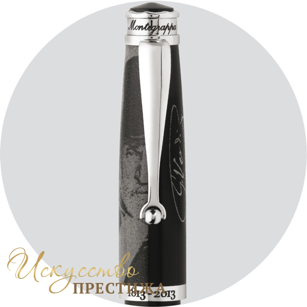Изящная перьевая ручка изготовлена из драгоценной смолы черного цвета. Лаконичные контрастные детали покрыты родием. Колпачок письменного инструмента украшает портрет композитора, нанесенный с помощью лазерной гравировки, и подпись музыканта. На кольце — надпись «Bicentenario» (двухсотлетний юбилей) и соответствующие ей годы 1813–2013. Венчает колпачок сдержанный логотип Montegrappa. На грип-секции размещена эмблема Фонда известного театра Реджио, который расположен в Парме, на родине Джузеппе Верди. Завершает композицию роскошное перо из белого золота в 18 карат, декорированное гравировкой в виде традиционного геометрического узора Montegrappa.