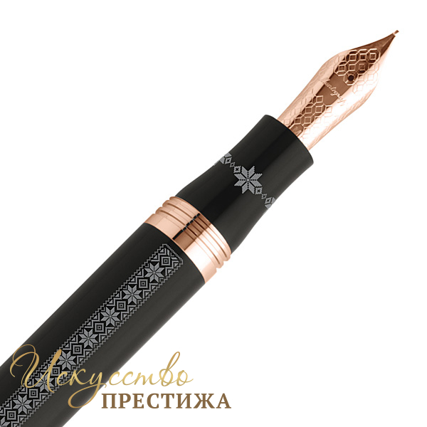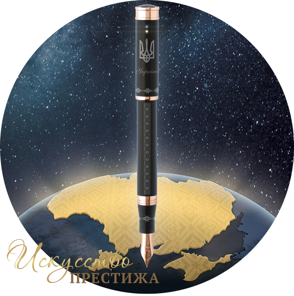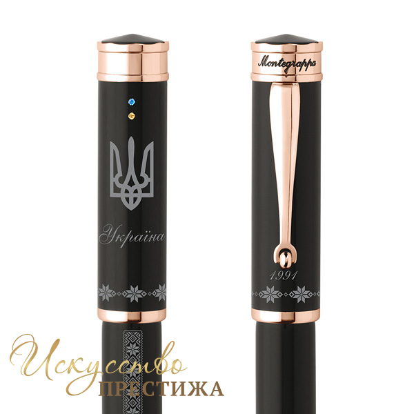 Корпус элегантной перьевой ручки, изготовленный из драгоценной смолы черного цвета, декорирован гравировкой в виде традиционного орнамента украинской вышиванки. Лаконичные детали подчеркивает розовое золото. Колпачок украшает изящный Трезубец, который венчают два кристалла Swarovski, перекликающиеся с цветами флага страны. Под Трезубцем - надпись «Україна». Под утонченным клипом — год провозглашения Независимости. Завершает композицию изысканное перо, покрытое розовым золотом и украшенное выгравированным геометрическим узором Montegrappa.