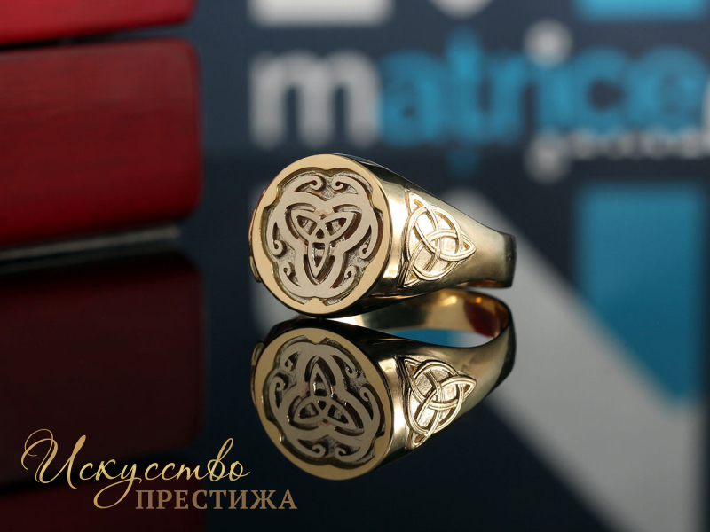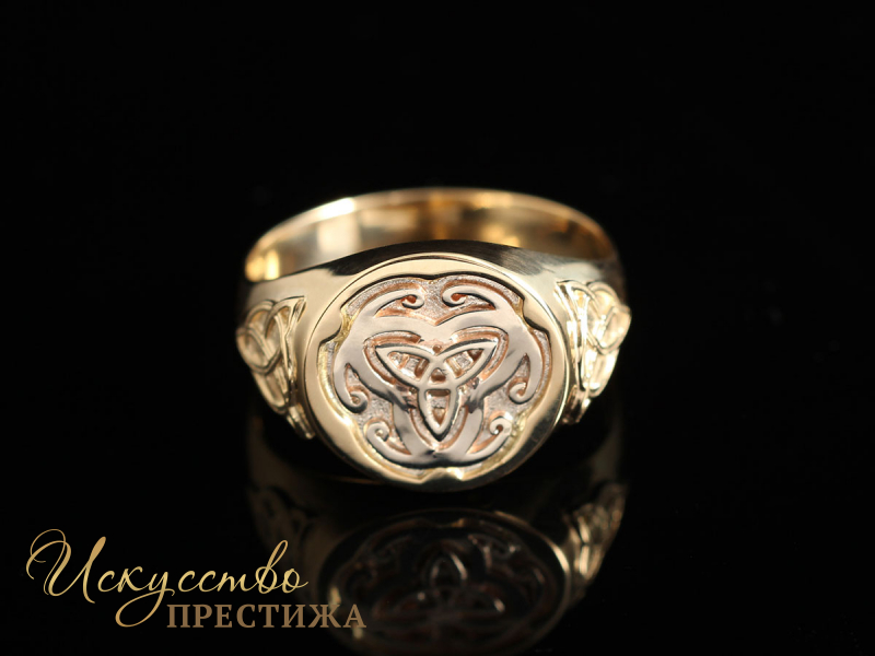 Перстень Кельтский "Трикверт". Изготовлен из комбинации белого и желтого золота 585 пробы. Перстень своим символом передает энергию солнца и отражает траекторию передвижения солнца по трем ключевым точкам на небосводе. Этот символ пришел к нам из глубокой древности и таит в себе мощный поток энергии и помогает человеку жить в гармонии.
