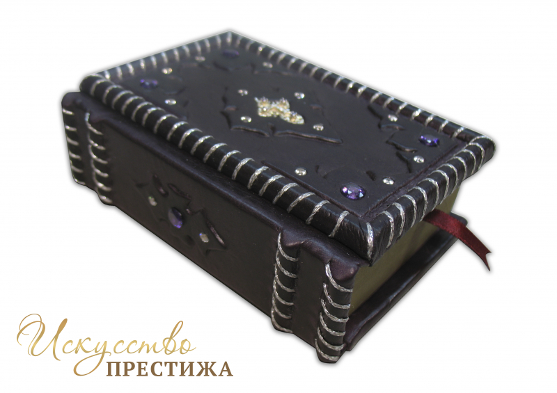 Французский переплет ручной работы, выполненный из натуральной кожи теленка «Melanzana», производства итальянской кожевенной фабрики «Carisma». Обложка книги оформлена объемными узорами ручного тиснения, плетением серебряной тесьмой, инкрустацией камнями циркон брильянтовой огранки (прозрачный, 3 мм. высший сорт, производства компании Signity) количеством 10 шт., камнями циркон (цвет аметист, 5 мм., высший сорт, производства компании Signity), количеством 5 шт., серебряным крестом (925 проба, инкрустация цирконом, вес 2,1 г.). Обрез книги вручную полирован и позолочен сусальным золотом.