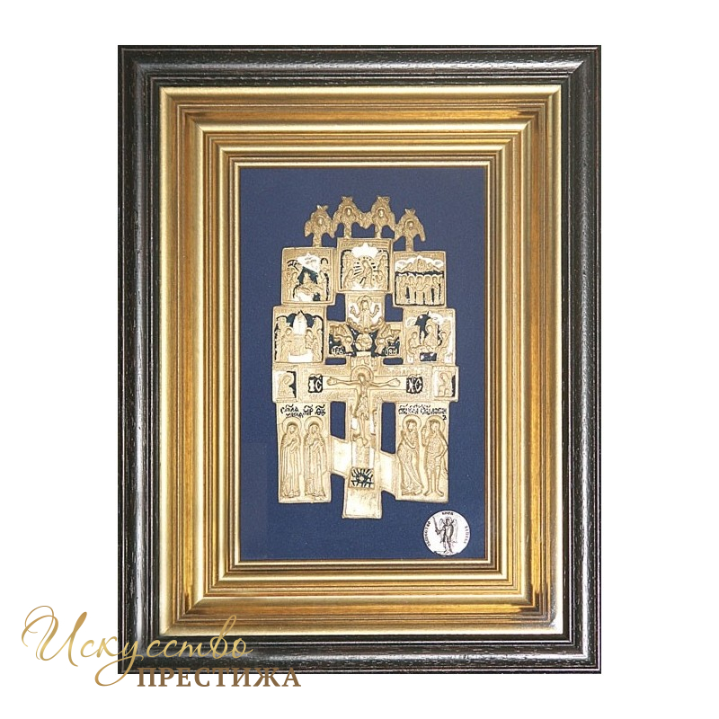 Распятье Христово оформлено на бархатном фоне.Работа украшена чистым Золото 585-й пробым и ювелирными эмалями.Рама с защитным стеклом.