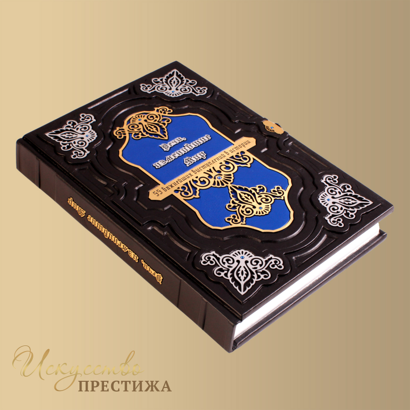 О переплете: переплет французский цельноКожаный, ручной работы. Кожа цвета эбенового дерева (Италия), а также вставка из кожи цвета "голубая лазурь". Рельеф на коже и тиснение выполнены вручную. Круглёные корешки книг украшают высокие бинты. Обложка декорирована гравированной композицией, цвет - "золото" с инкрустацией стразами Swarovski. Каптал шелковый, ручного плетения. Форзац составной. Обрез полированный, цвет - "серебро".