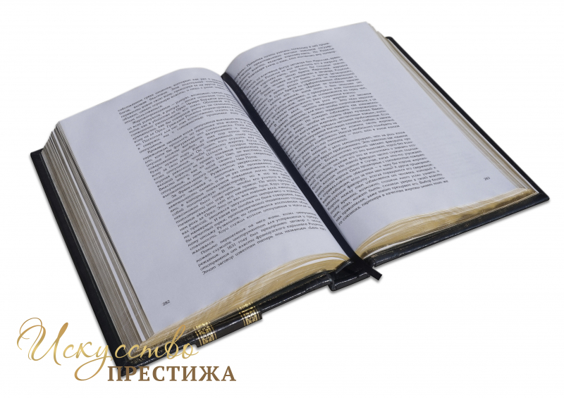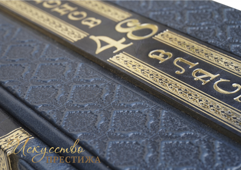 Французский составной переплет ручной работы выполнен из комбинации натуральных кож ( Кожа теленка «Robbat Blue», Кожа «Livido» производства итальянской кожевенной фабрики «Carisma»). Обложка книги оформлена комбинацией многоуровневого объемного тиснения: рельефного золотого, c использованием фольги «Luxor 240» и глубокого блинтового. Обрез вручную полирован и позолочен сусальным золотом.