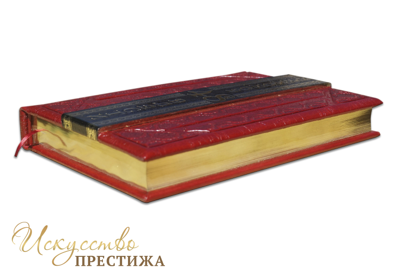 Французский составной переплет ручной работы выполнен из комбинации натуральных кож ( Кожа теленка «Robbat rosso», Кожа «Robbat nero» производства итальянской кожевенной фабрики Carisma»). Обложка книги оформлена комбинацией многоуровневого объемного тиснения: рельефного золотого, c использованием фольги «Luxor 240» и глубокого блинтового. Обрез вручную полирован и позолочен сусальным золотом.