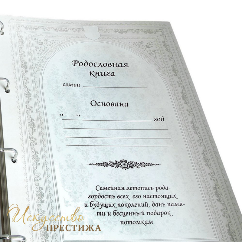 Наша книга посвящена этой возможности – ведению родословной фамилии. Это уникальный фотоальбом с летописью рода, персональными листами каждого родственника вашей семьи или семьи Вашего близкого человека, которому Вы подарите Родословную книгу. В персональных листах размещаются сведения о персонах рода, их фотографии, и их краткое жизнеописание. После заполнения персональных листов можно составить Родовое Древо, отобразив связи между ближайшими родственниками. Для этого в состав книги включен специальный лист, который позволит отобразить родственные связи до пятого колена. В книге есть календарь памятных дат, в котором отображаются важнейшие события истории Рода. Есть в книге и листы на которых владелец книги может оставить пожелания для следующих поколений, записать мудрые мысли или сделать рисунки.