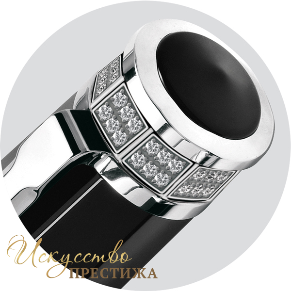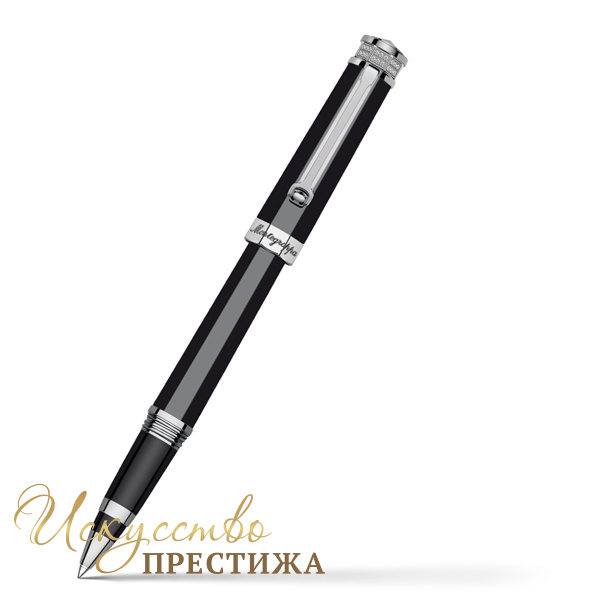 Роскошный роллер изготовлен из драгоценной смолы черного цвета. Безукоризненная восьмиугольная форма корпуса идеально сочетается с изящными деталями, покрытыми платиной. Колпачок оснащен удобным зажимом с вращающейся сферой. Элегантная вершина инкрустирована 48 сверкающими кристаллами Swarovski Zirconia. Выгравированный логотип бренда украшает центральное кольцо.