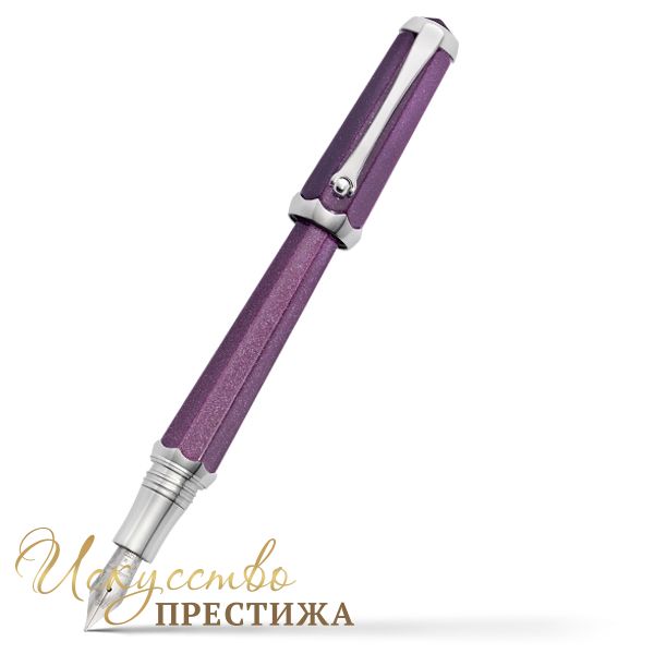 Восьмиугольный корпус изысканной ручки изготовлен из мерцающей драгоценной смолы необычного пурпурного цвета. Изящный силуэт письменного инструмента плавно сужается, приобретая слегка коническую форму. Лаконичные детали покрыты платиной. Элегантный колпачок в виде «плиссе» подчеркивает неординарность модели. Письменный инструмент оснащен удобным зажимом с вращающейся сферой. Завершающим акцентом перьевой модели является изысканное перо из белого золота в 18 карат.