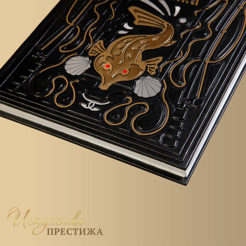 О переплете: переплет французский цельно-Кожаный, ручной работы. Кожа цвета "эбенового дерева"(Италия). Все элементы на обложке - высокий рельеф и тиснение по коже сделаны вручную. В центре - художественная композиция в виде рыбы–гравировка , цвет - "золото". Каптал шелковый, ручного плетения. Форзац составной. Обрез полированный, окрашенный вручную, цвет - "серебро".