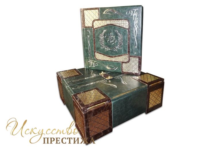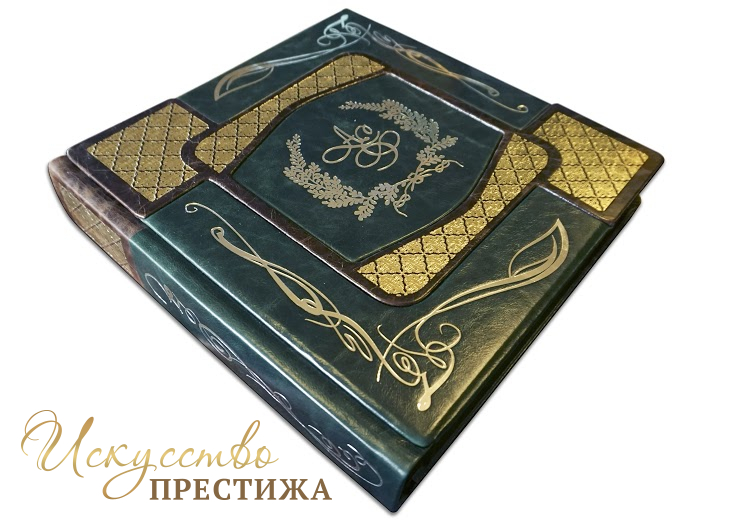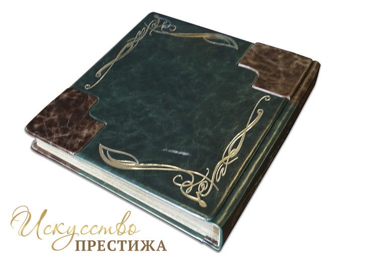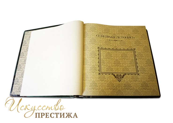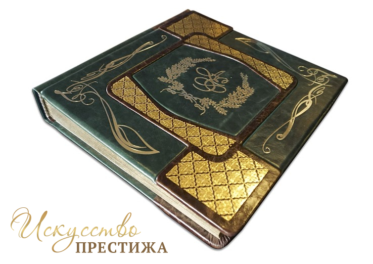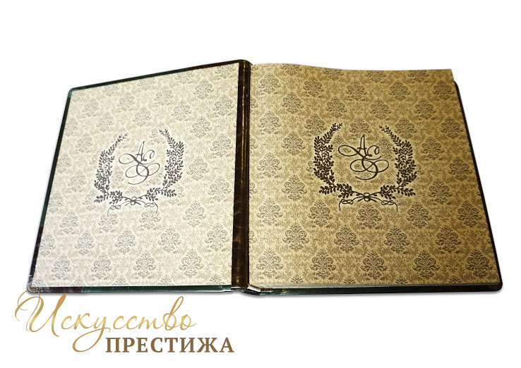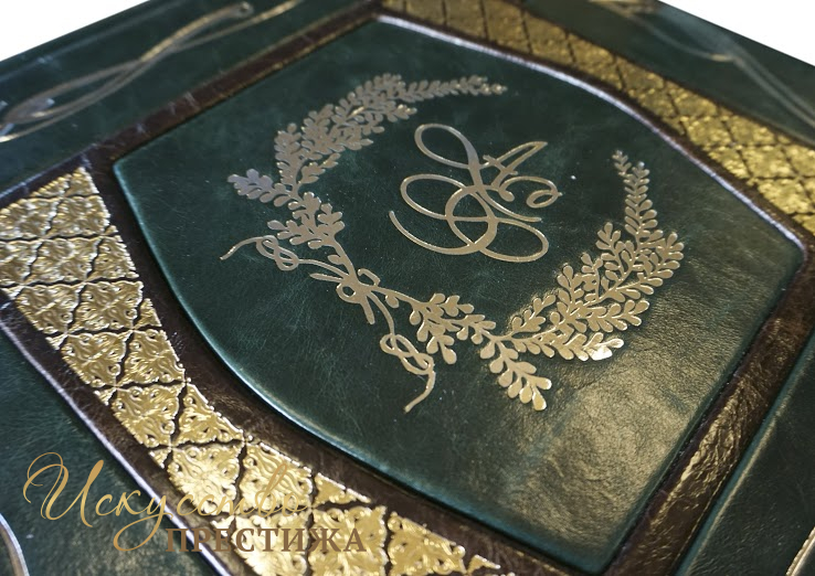 Изготовление под заказ в индивидуальном сочетании кожи и тиснение фамилии (герба) с инициалами на титульной обложке. Уникальное внутреннее оформление, место для фотографий, индивидуальное содержание. Печать на бумаге высшего качества. Также мастерская распечатает на холсте фотографии для оформления створок футляра. Внутренний блок может быть на магнитных листах или под двухсторонний скотч (приклеивание фотографий).