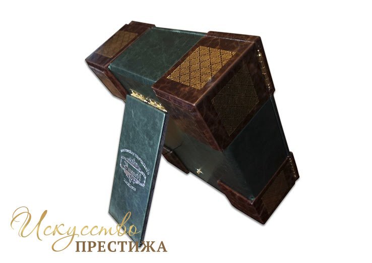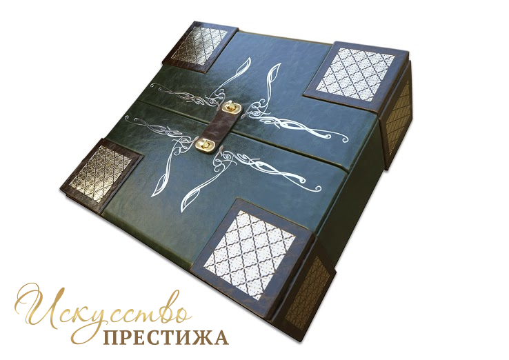 Французский составной переплет ручной работы изготовлен из комбинации натуральной кожи (кожа «Grash», кожа «Sparta Esil» производства итальянской кожевенной фабрики «Claudio»). Обложка книги и футляр двухуровневые, оформлены комбинацией золотого и серебряного тиснения, с использованием фольги «Luxor 240». Авторский футляр-попитюр, изготовлен полностью вручную, является органичным дополнением альбома, призван максимально усиливать эффект от подарочного комплекта.
