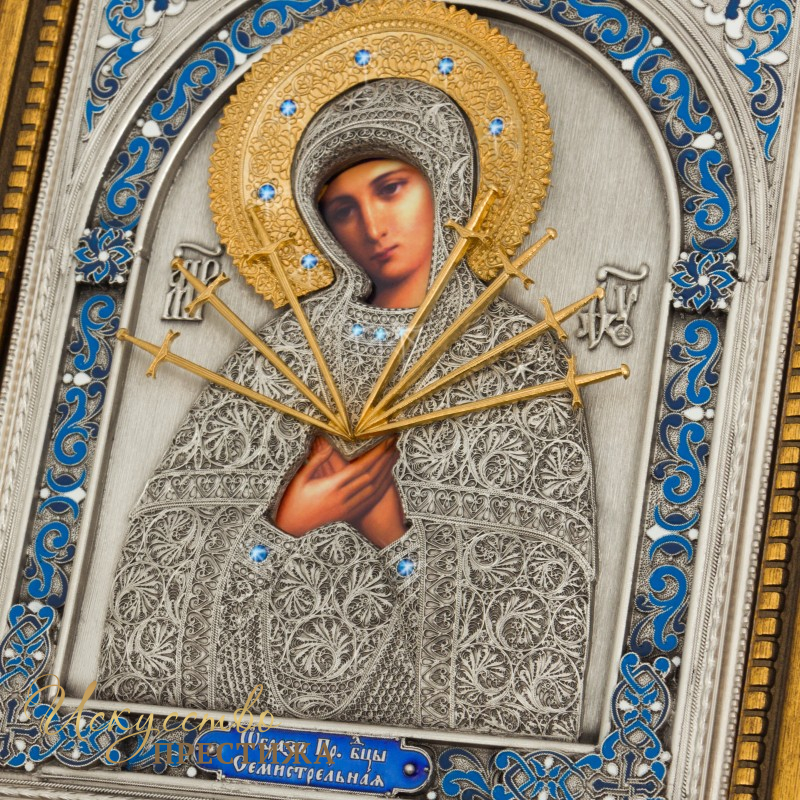 Икона Пресвятой Богородицы "Семистрельная" считается одной из самых чудотворных икон, которой на протяжении многих веков молились и просили о помощи, если начинались войны христиане. На иконе"Семистрельной" изображена Пресвятая Богородица с пронзающими сердце семи мечами, стрелами, которые означают "полноту" горя, печали перенесенной Богоматерью. Образ Богородицы почитается как хранитель домашнего очага.