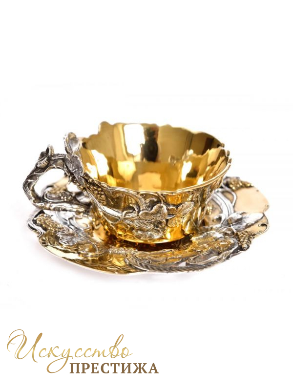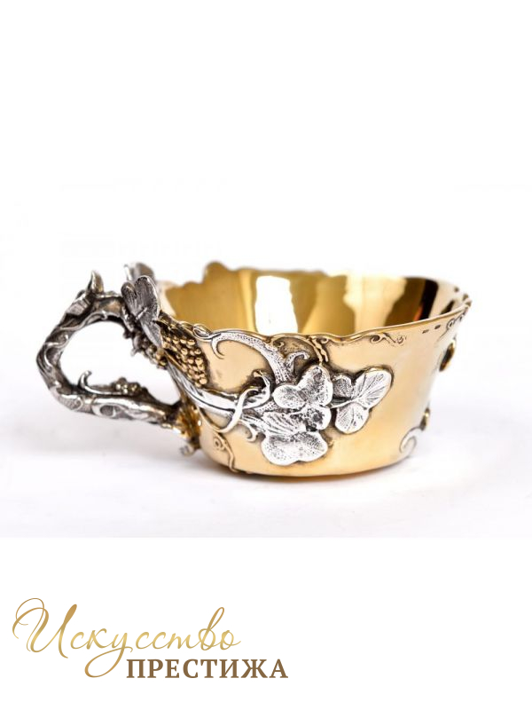 Оригинальная серебряная чашка с позолотой обвитая виноградной лазой.