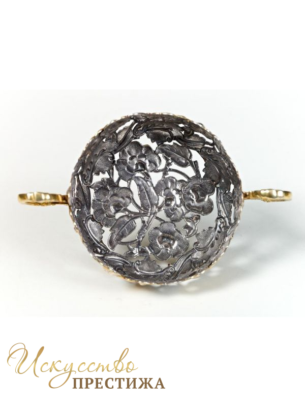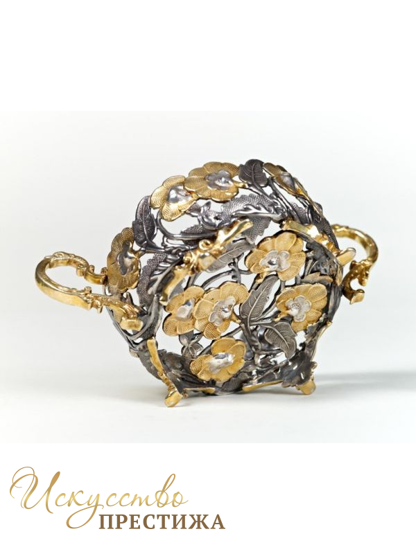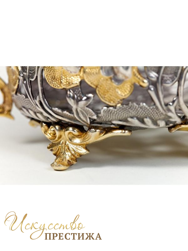 Красивая конфетница, богато украшенная цветами из серебра с позолотой.