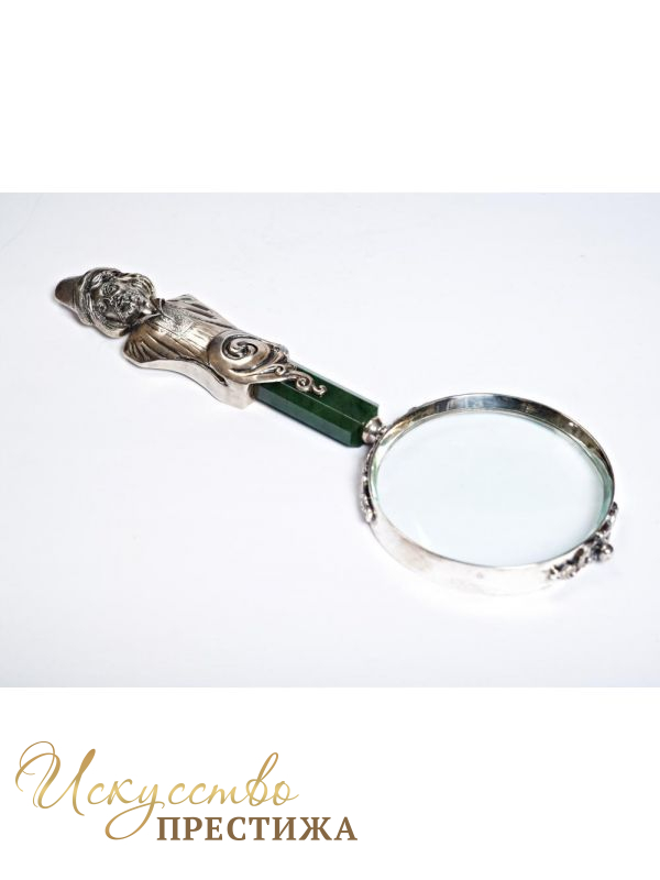 Великолепный сувенир, серебряная лупа с нефритом. В комплект можно приобрести серебряный нож для бумаги с такой же прекрасной ручкой.