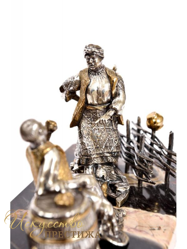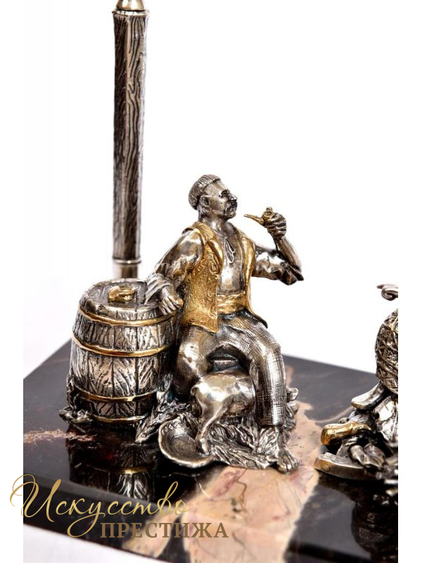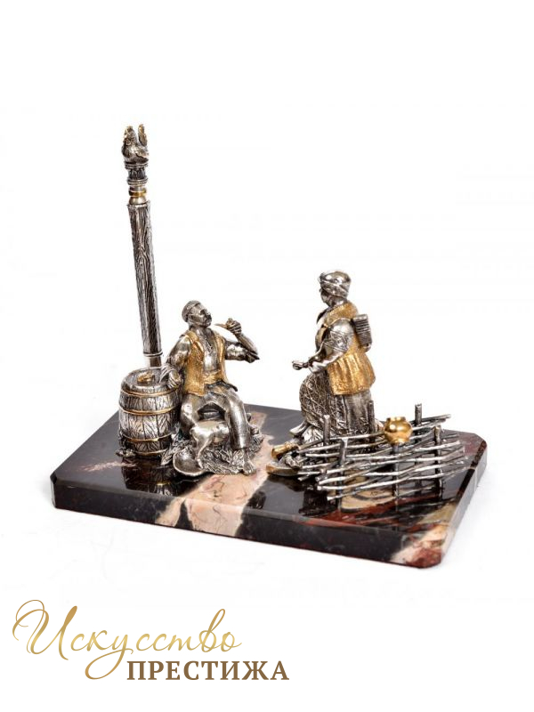 Оригинальная и дорогая подставка под ручку серебряная "Кум и кума"с позолотой.