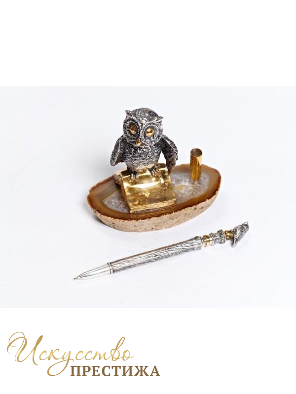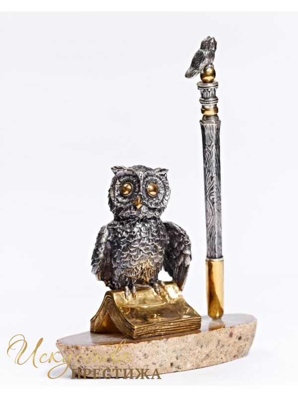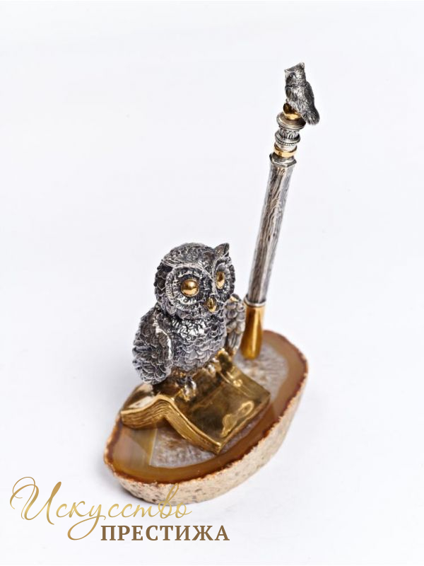 Красивая подставка для ручки с серебряной совой, сидящей на позолоченной книге с серебряной ручкой.
