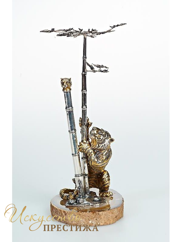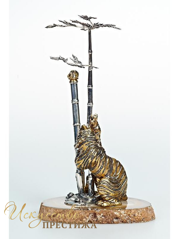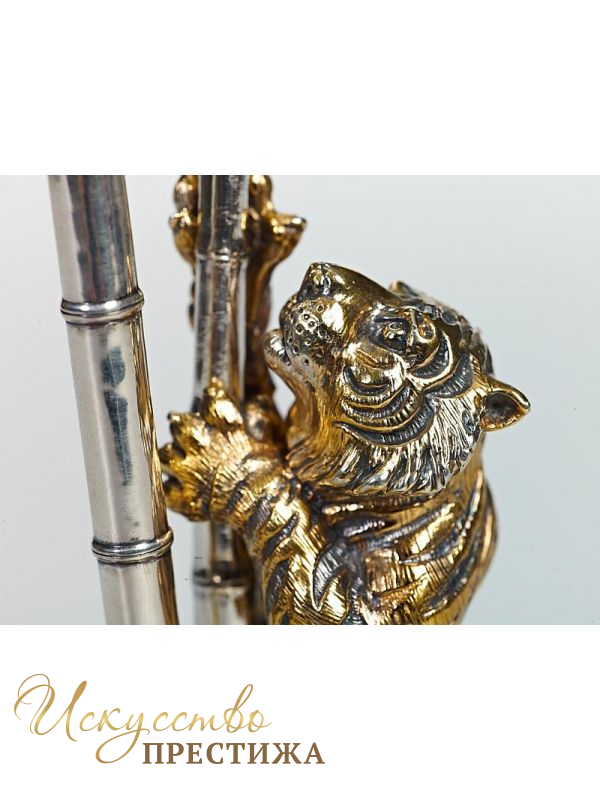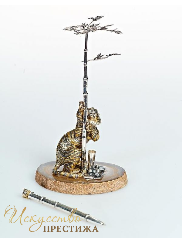 Оригинальная и дорогая подставка для ручки в виде красивого серебряного тигра с позолотой.