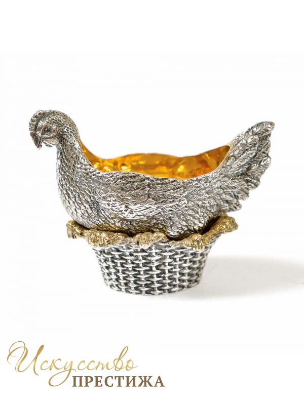 Красивый и интересный подарок, серебряная подставка для яйца с позолотой в виде курочки.