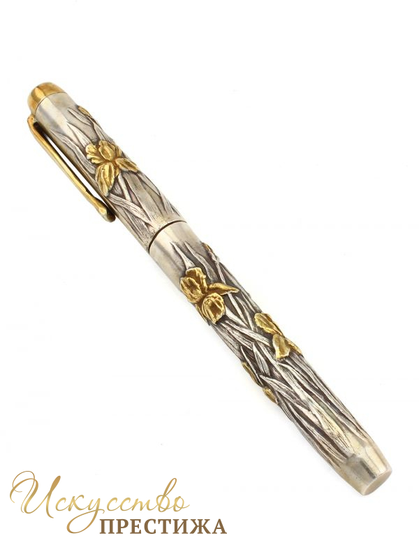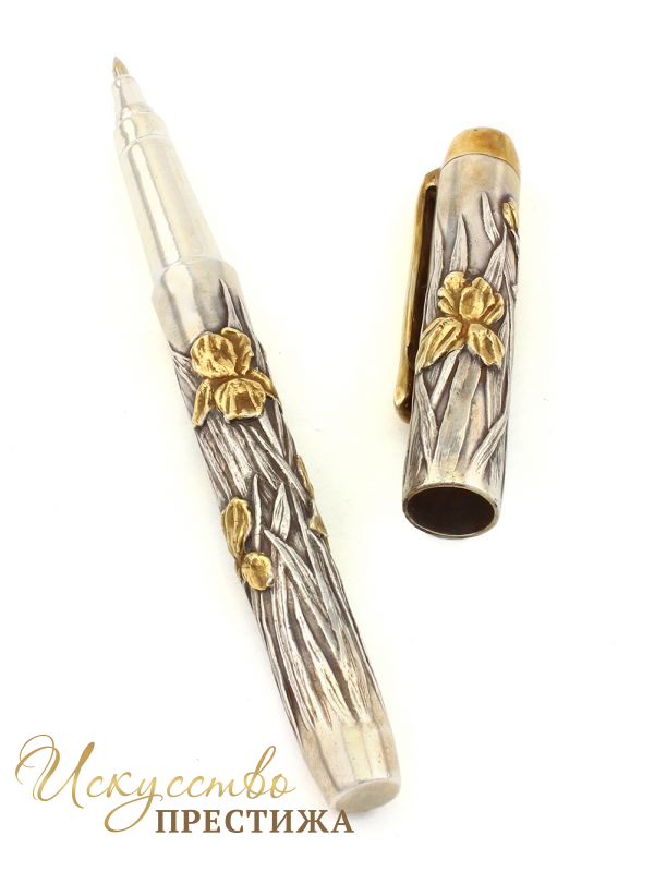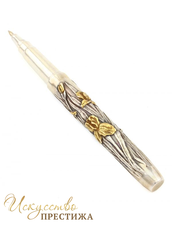 Ручка из серебра с колпачком украшена рельефным изображением цветов ирисов с позолотой. Длина ручки 13,5 см.