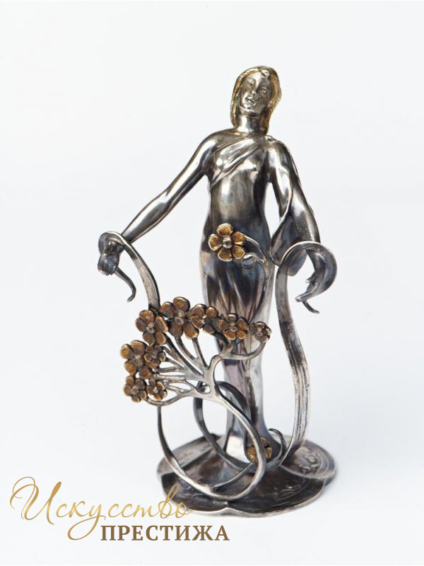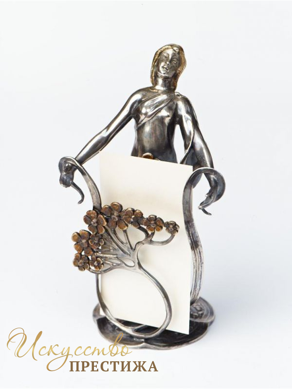 Оригинальная и красивая визитница из серебра с позолотой в виде симпатичной девушки.