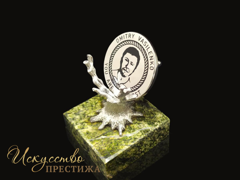 На фото - подарок руководителю на юбилей от работников компании. Монета с гравировкой изготовлена из серебра 925 пробы. Основной акцент - на изображении портрета именинника. Особый шарм изделию придает оригинальная серебряная подставка в форме дерева, растущего с мощной земли - мраморного камня. Дерево, покрытое платиной, символизирует долголетие и мудрость, а натуральный камень зеленоватой окраски - силу и терпение. Мы можем создать изделие в соответствии с вашими желаниями, учитывая все особенности заказа.