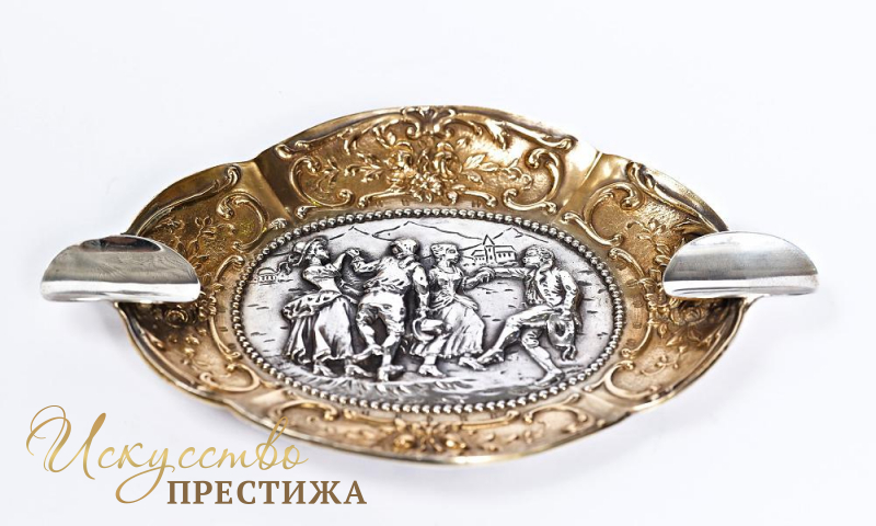 Серебряная пепельница с позолотой и красивыми узорами.