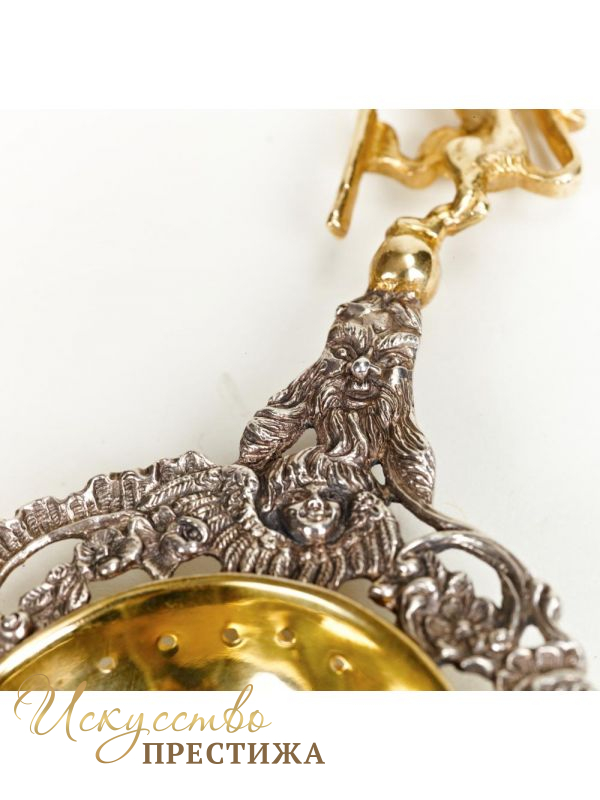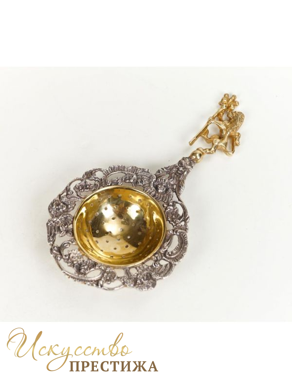 Оригинальное ситечко для чая. Серебро с позолотой. Длина ситечка 150 мм.