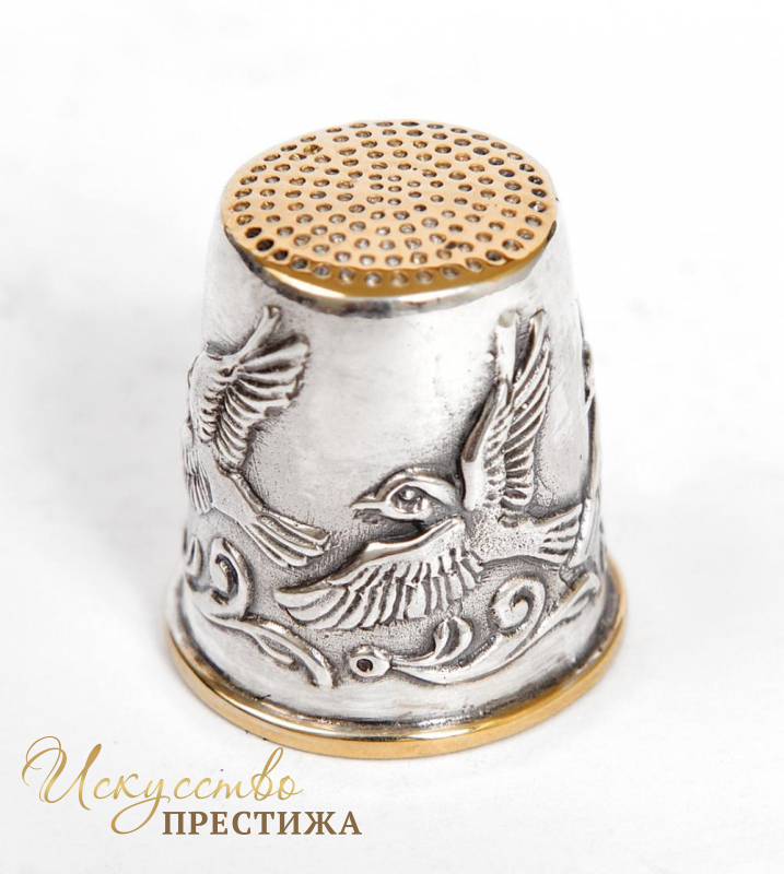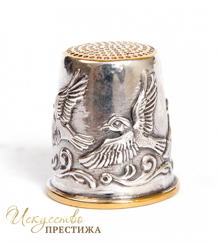 Миниатюрный напёрсток из серебра с позолотой с изображением птиц.