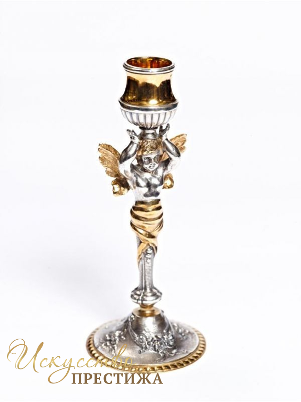 Красивый и изысканный подсвечник из серебра с милым ангелком.