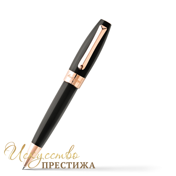 Изысканная шариковая ручка гармонично совмещает в себе утонченную роскошь и лаконичный дизайн. Стильный корпус письменного инструмента изготовлен из драгоценной смолы черного цвета и украшен контрастными деталями, покрытыми розовым золотом. Кольцо колпачка декорировано сдержанным логотипом бренда. Год создания компании традиционно венчает верхушку. Надежный внутренний механизм и безукоризненное итальянское качество подчеркивают универсальность модели.