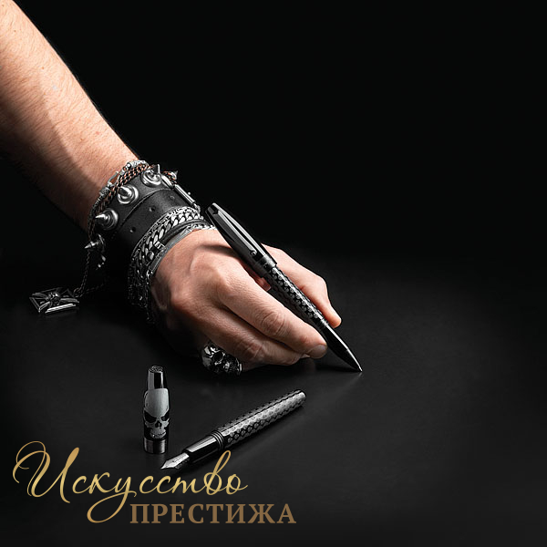 Эффектная ручка идет в комплекте со стильной шкатулкой черного цвета, крышку которой украшает внушительный череп.