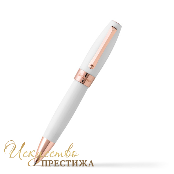 Изысканная шариковая ручка гармонично совмещает в себе утонченную роскошь и лаконичный дизайн. Стильный корпус письменного инструмента изготовлен из драгоценной смолы белого цвета и украшен контрастными деталями, покрытыми розовым золотом. Кольцо колпачка декорировано сдержанным логотипом бренда. Год создания компании традиционно венчает верхушку. Надежный внутренний механизм и безукоризненное итальянское качество подчеркивают универсальность модели.