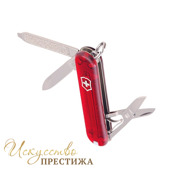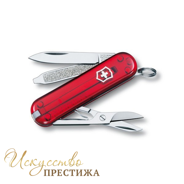Гламурный складной нож «Classic SD» 0.6223.T швейцарского бренда Victorinox – это компактный, карманный и широко известный аксессуар, он будет великолепным подарком для прекрасной дамы, которая отдаёт предпочтение надёжности и долговечности. Для того, чтобы сделать нож более женственным, производитель сделал рукоятку прозрачной и окрасил её в красный цвет, тем самым добавил яркости и настроения этому маленькому аксессуару. Нож изготовлен из высококлассных материалов, таких как высококачественная нержавеющая сталь и пластик. Благодаря своим небольшим размерам, качеству и универсальности этот нож давно зарекомендовал себя идеальным спутником в любой поездке или путешествии. Эта модель имеет конструкцию, состоящую из ножниц, пилочки, клинка, кольца для подвеса, которое даёт возможность его носить на ключах как брелок, пинцета и зубочистки. По задумке дизайнеров, нож можно спрятать в удобный чехол, который идёт в комплекте. Компания даёт пожизненную гарантию качества использованных материалов.