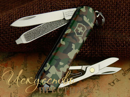 Складной армейский нож "Classic SD" 0.6223.94 швейцарского бренда Victorinox – это компактный, карманный аксессуар, он будет великолепным подарком как для мужчин, так и для женщин, которые отдают предпочтение надёжности и долговечности. В основу производства положены современные технологии и оригинальные чертежи 1891 года. Современный дизайн модели - это его оригинальный камуфляжный принт и логотип компании Victorinox, хорошо известный во всем мире. Нож изготовлен из высококлассных материалов, таких как высококачественная нержавеющая сталь и пластик. Благодаря своим небольшим размерам, качеству и универсальности этот нож давно зарекомендовал себя идеальным спутником в любой поездке или путешествии. Эта модель имеет конструкцию, состоящую из ножниц, пилочки, клинка, кольца для подвеса, которое даёт возможность его носить на ключах как брелок, пинцета и зубочистки. По задумке дизайнеров, нож можно спрятать в удобный чехол, который идёт в комплекте. Компания даёт пожизненную гарантию качества использованных материалов.