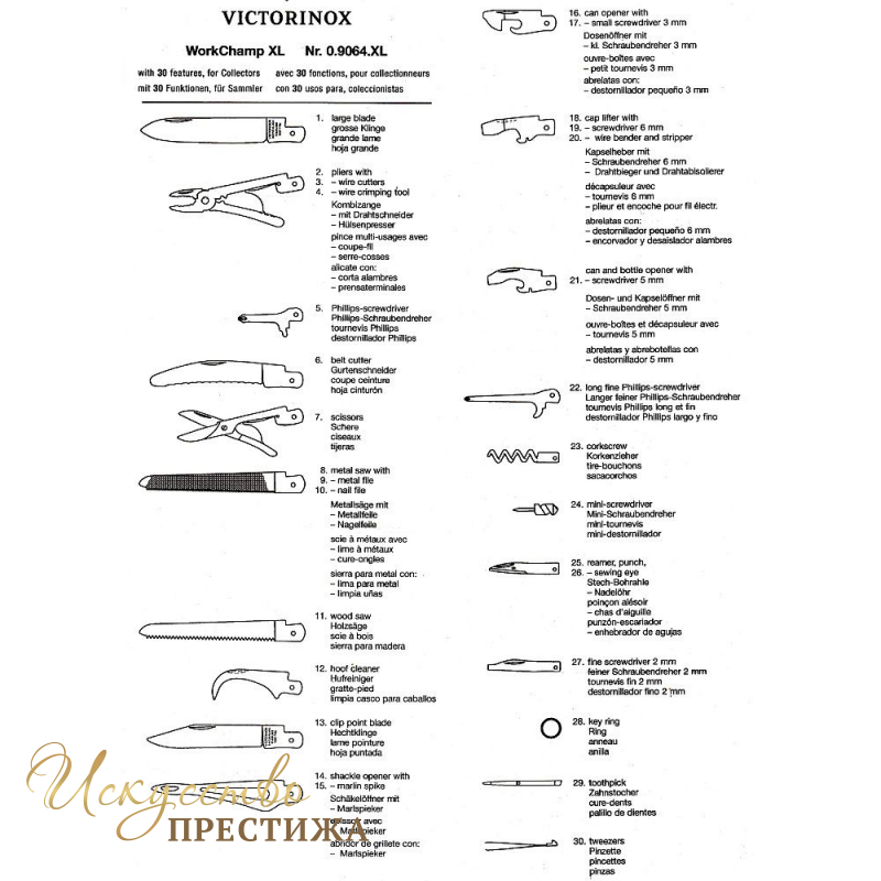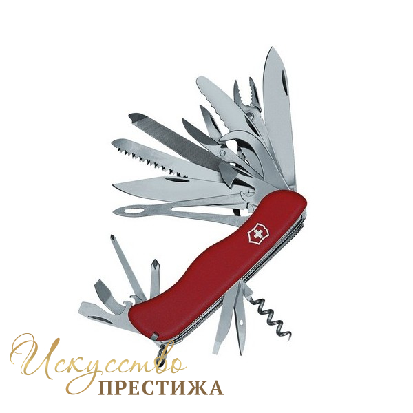 Складной армейский нож "WORKCHAMP" 0.9064.XL швейцарского бренда Victorinox - это компактный, карманный и широко известный аксессуар, он будет великолепным подарком для мужчин, предпочитающих надёжность и долговечность. В качестве бонуса, швейцарский нож оснащён специальным механизмом типа Liner-lock, который обеспечивает надёжную фиксацию лезвия в открытом положение, предотвращая его самопроизвольное складывание. В состав ножа входит большой клинок с фиксацией, штопор, шило с ушком, кернер, нож для открывания консервов, малая плоская отвертка, открывалка для бутылок, плоская отвертка, инструмент для снятия изоляции, кольцо для подвеса, пинцет, зубочистка, пила по дереву, пассатижи, кусачки для провода, инструментом для обжима, малая и большая крестовая отвертка (толстая) Phillips, напильник и ножовка по металлу, пила по дереву, ножницы, штопор, стропорез. Нож изготовлен из высококлассных материалов, таких как высококачественная нержавеющая сталь и пластик. Благодаря удобной форме с выемками для пальцев на пластиковой рукоятке, ваша рука не будет скользить. На всю продукцию компания даёт пожизненную гарантию качества использованных материалов.