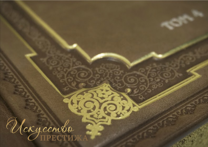 Французский составной переплет ручной работы выполнен из натуральной кожи «Latte al forno» производства итальянской кожевенной фабрики «Benerichetti». Обложки книг декорированы многоуровневым тиснением: глубоким блинтовым, комбинацией рельефного золотого и серебряного тиснения (использована фольга «Luxor 240»). Обрезы книг оформлены в уникальной технике «Хамелеон» с использованием сусального золота. Деревянная подставка выполнена из дуба, декорирована итальянским коттонбархатом. Тираж 3 номерных экземпляров. Сертификат. Бархатный чехол. Книги отпечатаны на бумаге высшего сорта «Palatina» цвета «слоновая кость» (производства итальянской фабрики «Fabriana»).