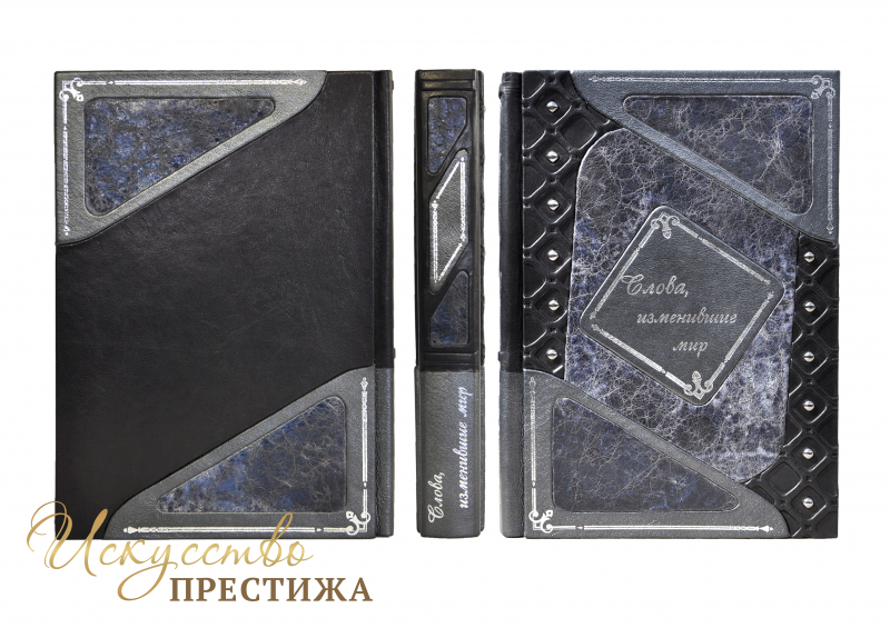 Французский составной переплет ручной работы выполнен из комбинации натуральных кож (Кожа теленка «Nero Zegna», Кожа маррокен «Patina blu», Кожа «Acciaio» производства итальянской кожевенной фабрики «Benericetti»). Обложка книги оформлена в авторской технике декора «Кожаный витраж» , обрамлена объемными узорами ручного тиснения, рельефным серебряным тиснением, с использованием фольги «Luxor 240», никелевыми холитенами общим количеством 12 штуки. Обрез книги полирован и оформлен вручную сусальным серебром и синей паталью. Тираж – 5 переплетных экземпляров. Сертификат. Бархатный чехол