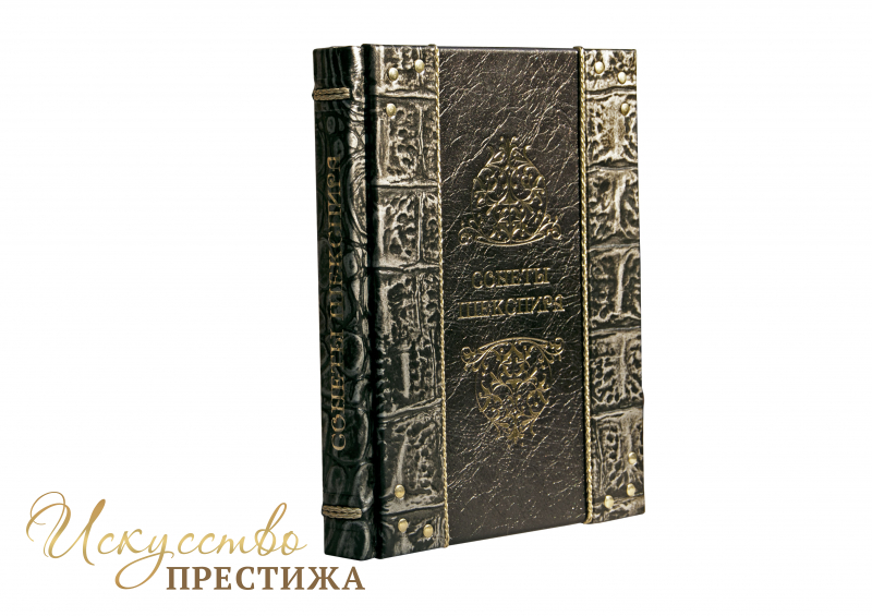 Французский переплет ручной работы, выполнен из комбинации натуральных кож (Кожа «Plonge Brown», Кожа «Argento dinosauro» производства итальянской кожевенной фабрики «Claudio». Обложка книги двухуровневая оформлена рельефным золотым тиснением (фольга «Luxor 240»), вставками из плетенного Кожаного шпагата (цвет «Bronze»), латунными холитенами, количеством 12 шт. Обрез полирован и окрашен вручную (цвет «Bronze»).